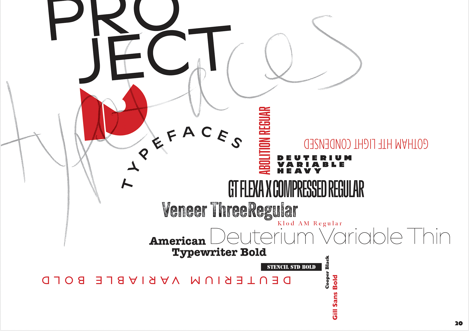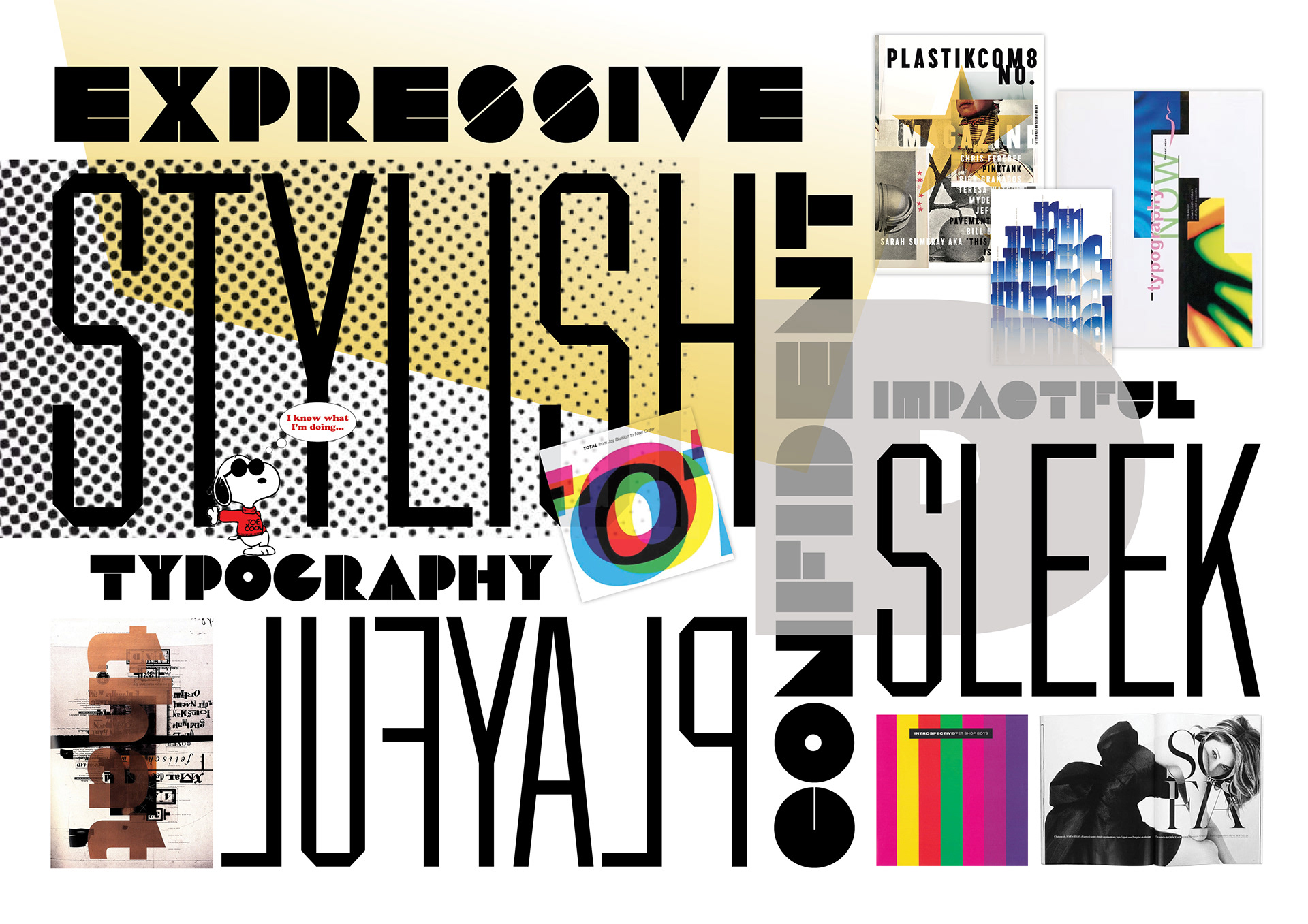 Playful typographic design to describe myself as a designer and to show work that has influenced me. The work of Vaughan Oliver, Peter Saville, and Mark Farrow for V23, New Order and Pet Shop Boys respectively is shown here along with avant garde magazine Plastikomb, Why Not Associate's Typography Now book, Dafi Kühne's typographic poster for Tunnel-Glarus club and Fabien Baron's art direction for Harper's Bazaar magazine