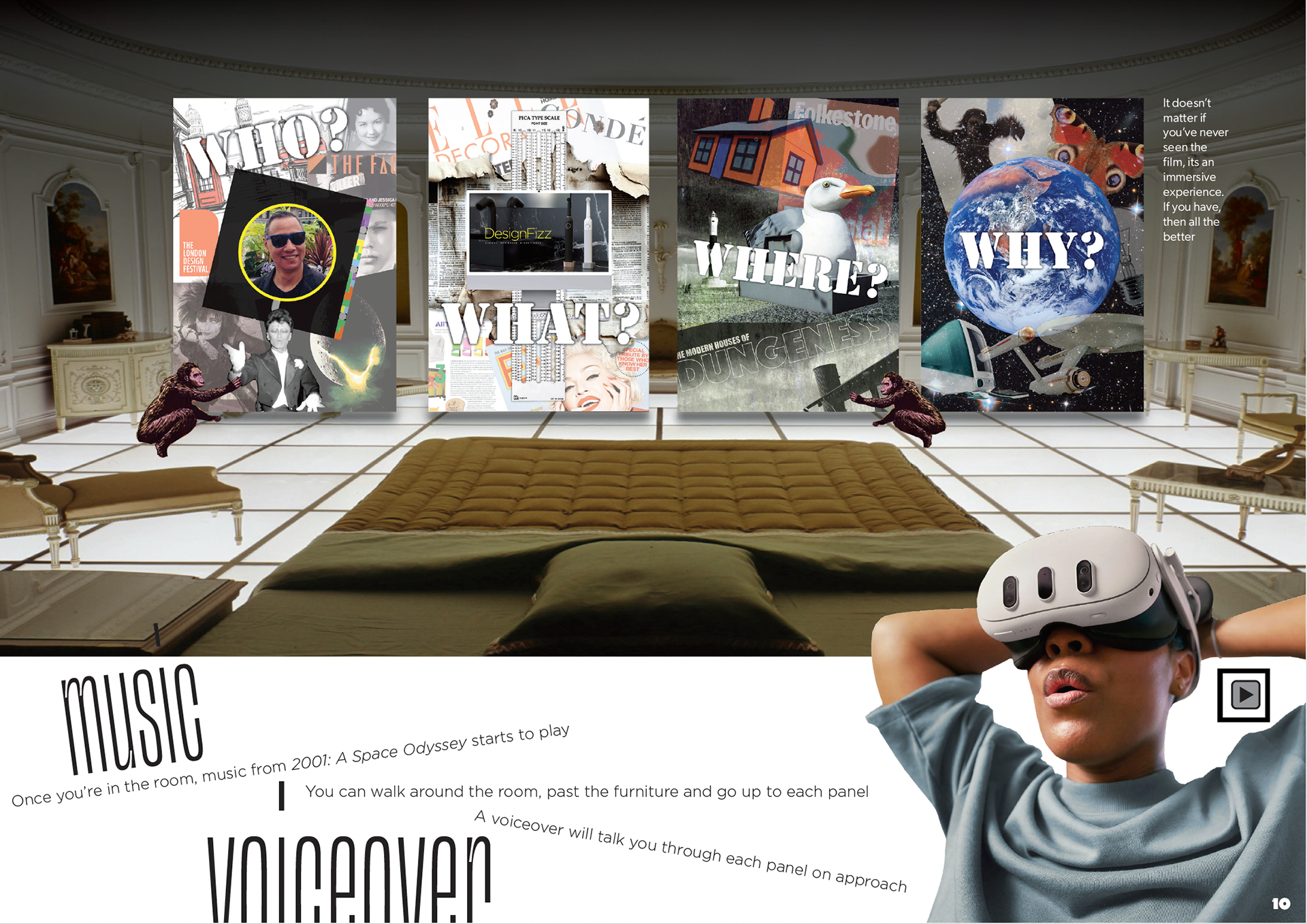 Design for a VR exhibition with photocollage panels to describe who I am, what I do, where I live and why design is important to me. It features the bedroom from 2001: A Space Odyssey with the panels replacing the original black monolith. This was a interactive page in that music from the film plays when seen in a VR headset